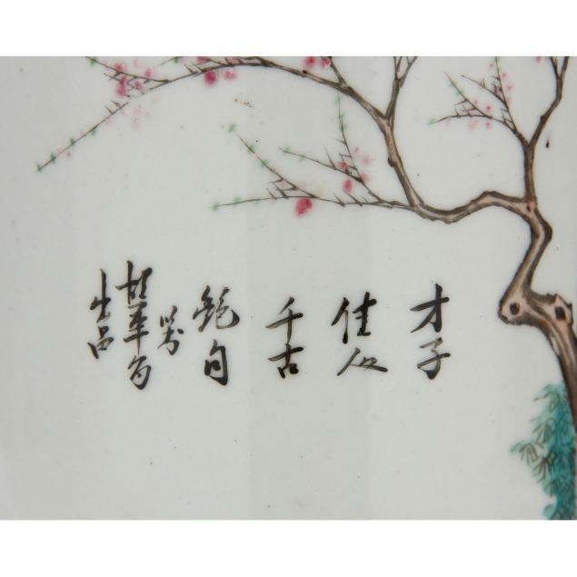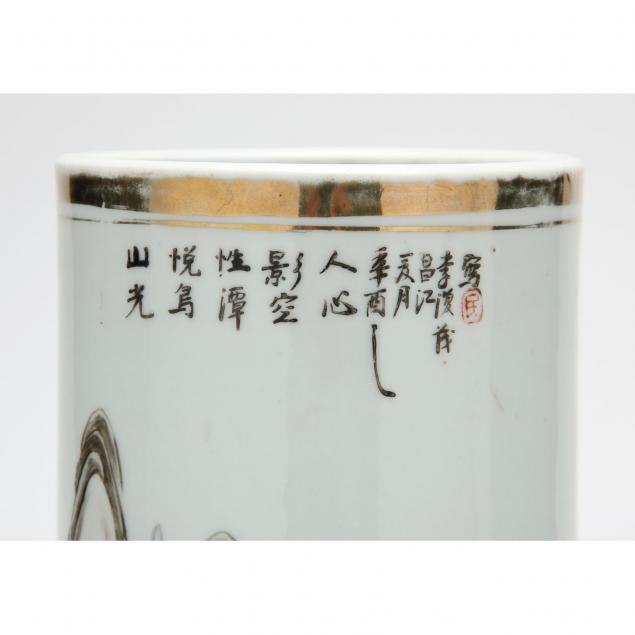 Porcelain, of cylindrical form, one painted with a scene of ladies in a garden, the second painted with a mountainous landscape scene, each with artist seal mark.