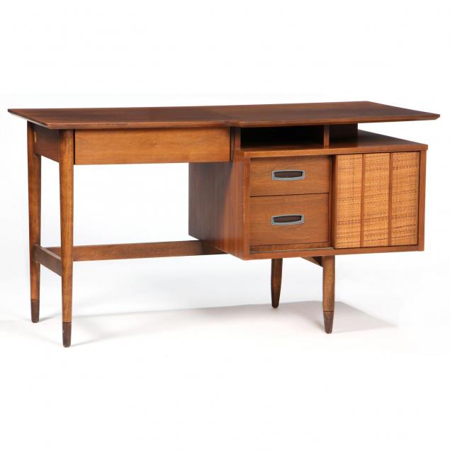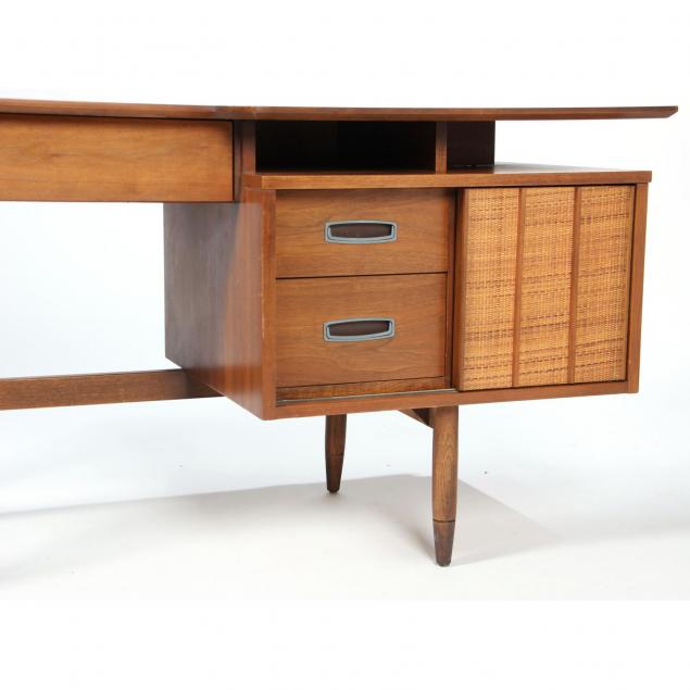 Circa 1960, walnut, left kneehole compartment with single upper drawer, the right with open shelf over sliding woven panel door revealing two drawers, flanked by two drawers with shaped metal pulls, raised on four tapered legs, the back with open bookshelf compartment, Hooker Furniture mark to interior of drawer.