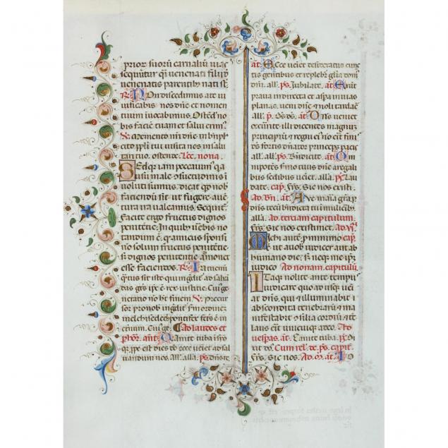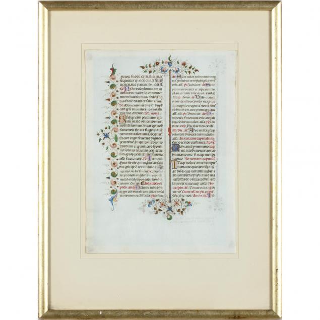 Early 15th century, on vellum, presented in a gilt double-sided frame exposing both sides of the sheet. A card affixed to the back states the work was "Authenticated by William Bond, Curator of Manuscripts, Houghton Library, Harvard University, 1960."