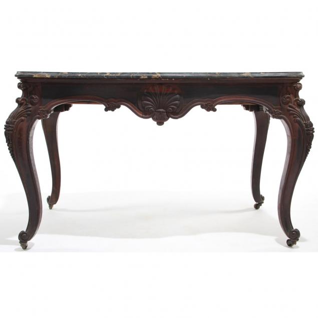Continental, 1860s, shaped turtle top of black veined marble supported by a carved base of rosewood and rosewood veneers, each side with a concave drawer, elegant cabriole legs with whorl foot on casters.