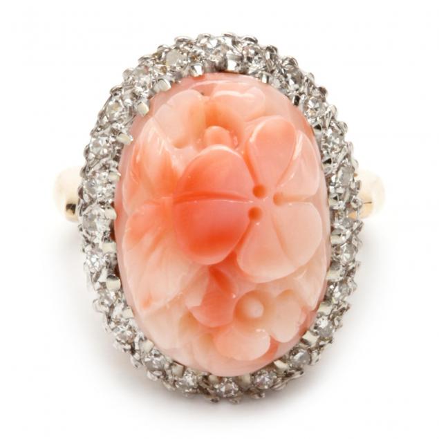 The carved oval coral in a floral design and prong set in white gold and framed by (24) bead set single cut round diamonds (1.50mm) weighing approximately .36 carat (H color, VS1 clarity) and with a 14KT yellow gold mount.