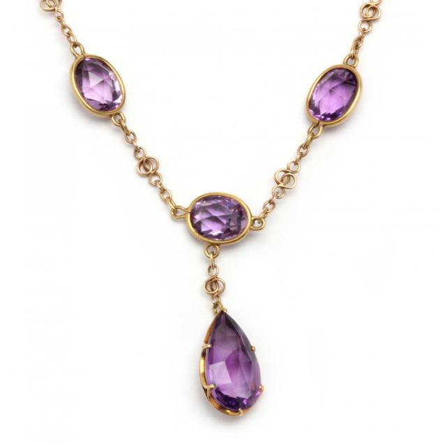 The yellow gold delicate necklace set with (7) oval cut amethysts bezel set and spaced within a modified fancy cable chain and suspending one prong set pear shaped cut amethyst, completed with a barrel form style clasp, unmarked and testing 18KT. Amethysts weigh approximately 14.26 total carats and with a dark moderate strong purple color with a cut grading of good.