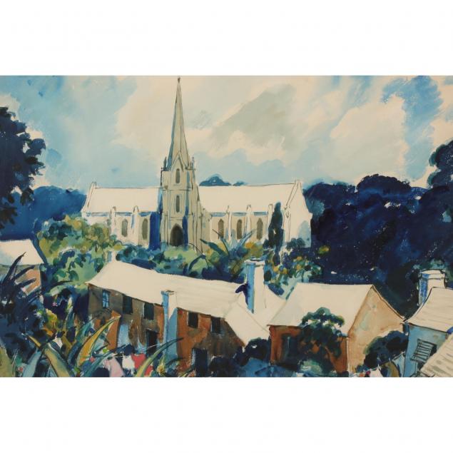 Watercolor and gouache on paper, signed at lower right, matted and framed under glass.