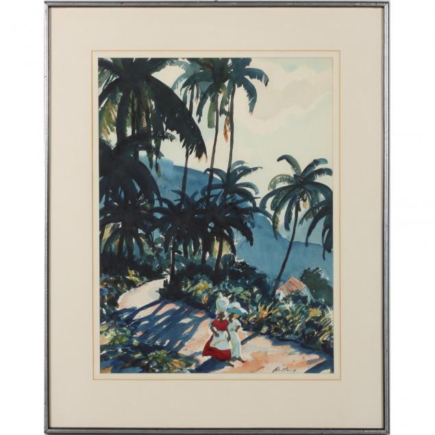 Watercolor and gouache on paper, signed at lower right, matted and framed under glass.
