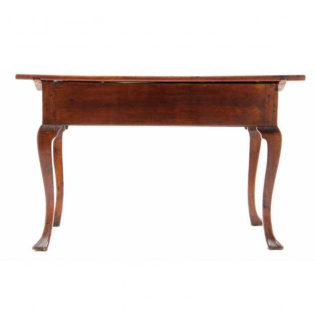 Late 18th century, cherry top with walnut frame, yellow pine secondary, three side by side lipped drawers, cabriole legs with stocking feet.