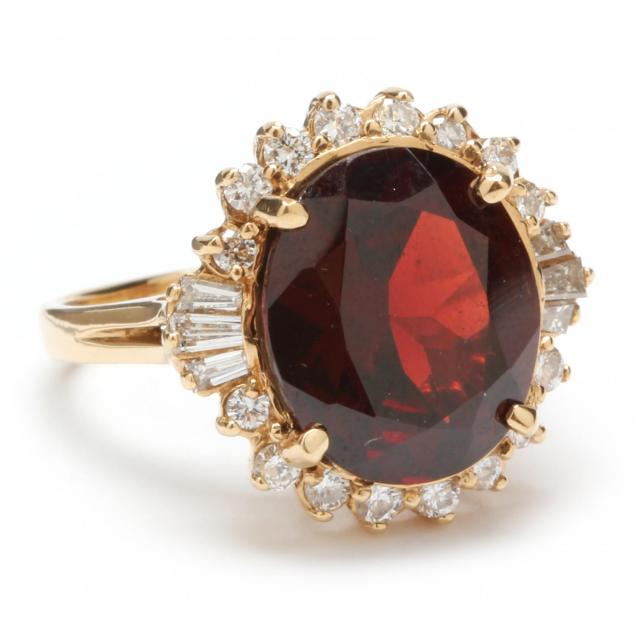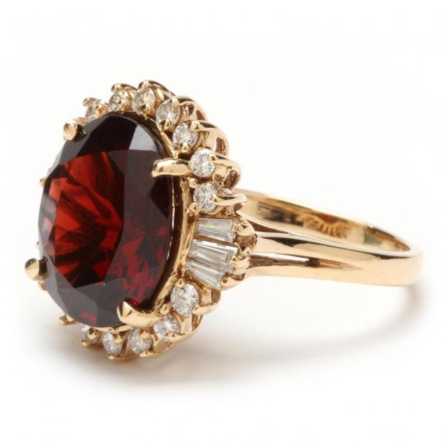Ring set to the center with one oval cut rhodolite garnet (14.05 x 12.00 x 6.70mm) weighing approximately 8.97 carats and framed by (16) full cut round diamonds (2.00mm) and accented on each side of the shank with (3) tapered baguette diamonds with a combined weight of .66 total carat (G color, VS1-VS2 clarity) in a yellow gold mount.