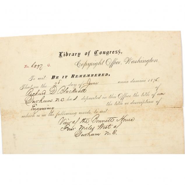 A modest North Carolina farm known as the "Bennett Place" became the site of the Civil War's largest surrender on April 26, 1865 when William T. Sherman accepted Joseph E. Johnston's sword. In 1876 entrepreneur Richard D. Blackwell of Durham, NC secured a copyright to produce and sell lithographs of the shrine. Items relating to this project are offered as follows: Albumen photograph,"The Bennett Place," inscribed "Photographed by E. F. Small" on the mount's lower margin with blind stamp on the print, the view has the elderly James Bennett standing by his farm gate (8 x 10 in. overall) (fading and stains; back album paper adheres to the back); Lithograph, "View of the Bennett House / Four Miles West of Durham, N.C.," the engraving being after Small's photograph (8 x 10 in.) (light browning; chips); Partially printed document granting Blackwell a copyright for the image, Library of Congress, Washington, D.C., June 2, 1876, one page with its original postal cover; Receipt from printer Thomas Hunter of Philadelphia for producing 1,500 "Bennett House" lithographs; A manuscript advertising rate sheet, one page, 8vo, from the American Newspaper Advertising Agency, n.p., itemizing costs for placing ads in Northern and Border state papers that would be read by Union veterans.