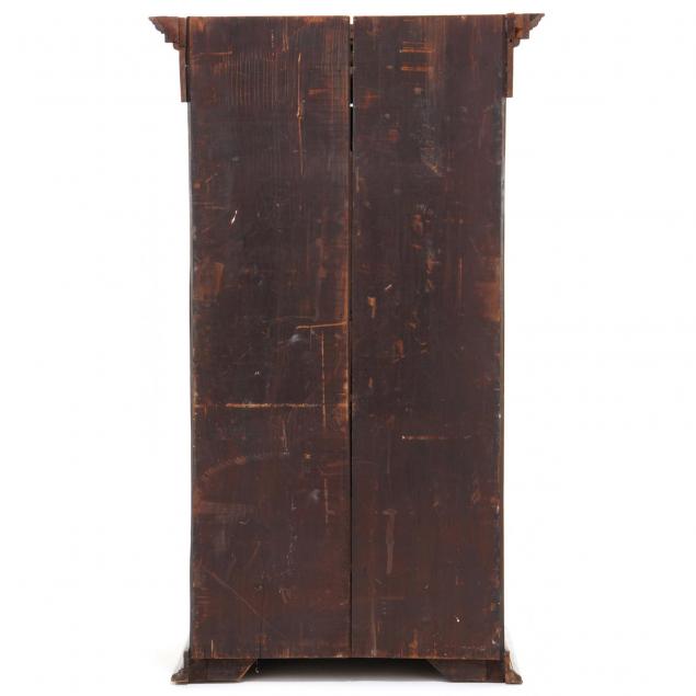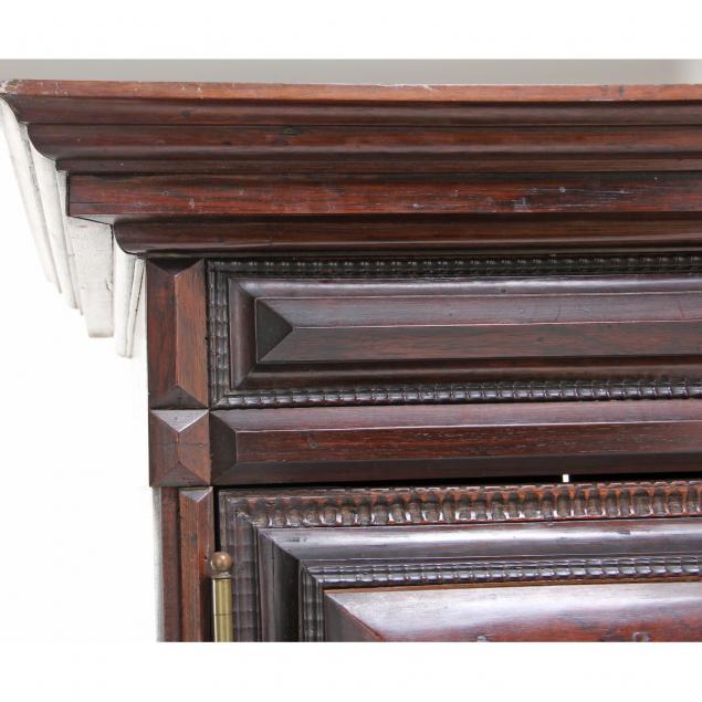 18th century or earlier, walnut, rosewood and other hardwoods, unusual verticle form with two upper hinged cabinet doors above two side by side drawers above three long drawers, all with central dome panel, bordered with ribbon molding, applied molded cornice and flush base.