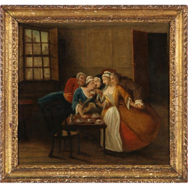 Oil on canvas (lined), unsigned, a figural group gathers around the tea table in a fine city interior as an old hag reads their coffee grounds, presented in a period appropriate gilt composition frame.