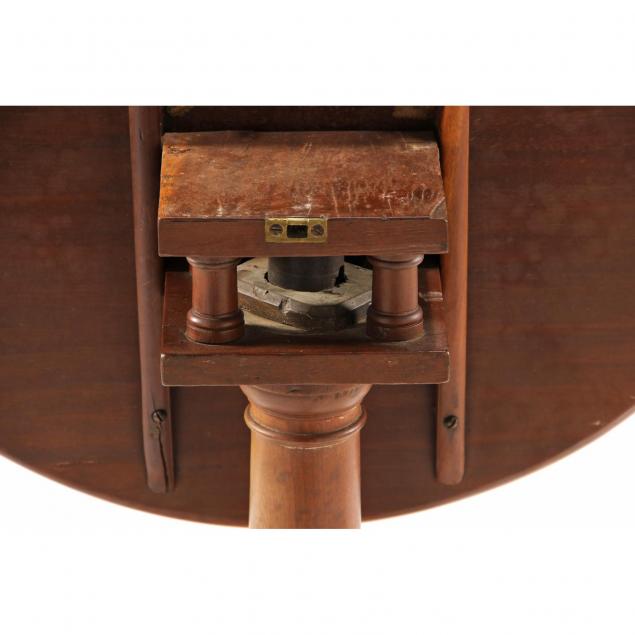 Mid 18th century, mahogany, circular one board tilt top, birdcage, tripod base with raised pad foot.