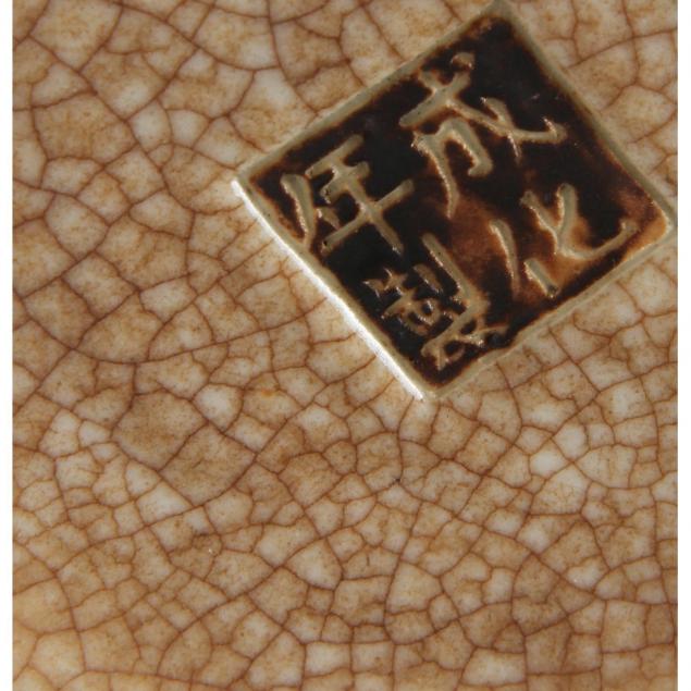 Squat bottle neck form with applied and carved decoration featuring a masted sailboat beneath a pine tree, four character mark to underside.