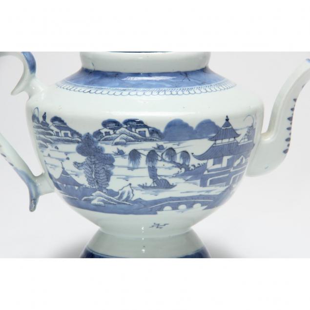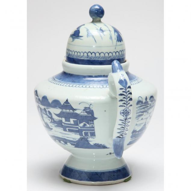 First half 19th century, bulbous form with high domed lid, scrolled handle and spout, flared footed base.