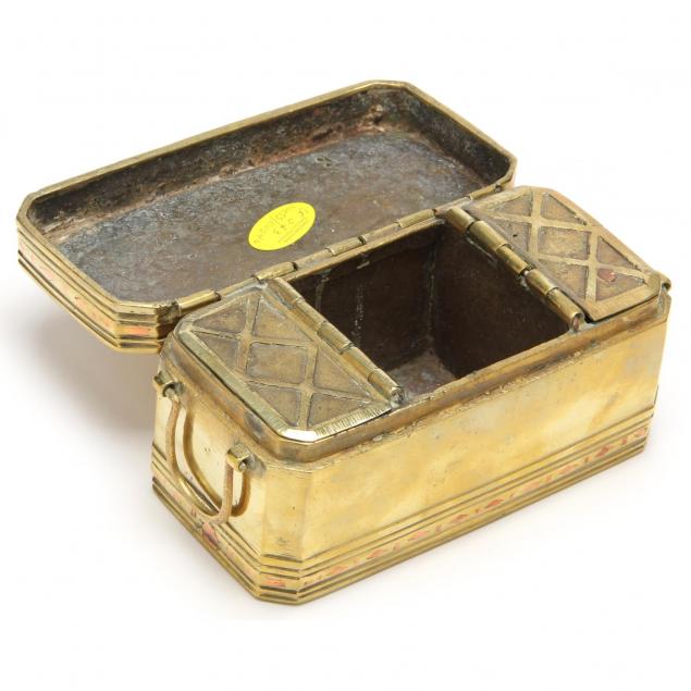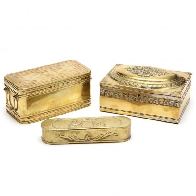 The first an 18th century Dutch tobacco box (7 in. length); the second an inlaid copper and brass betel nut box, late 17th - early 18th century; and a French box with embossed medallion to hinged cover and ivy border to sides, velvet lining, first quarter 19th century.