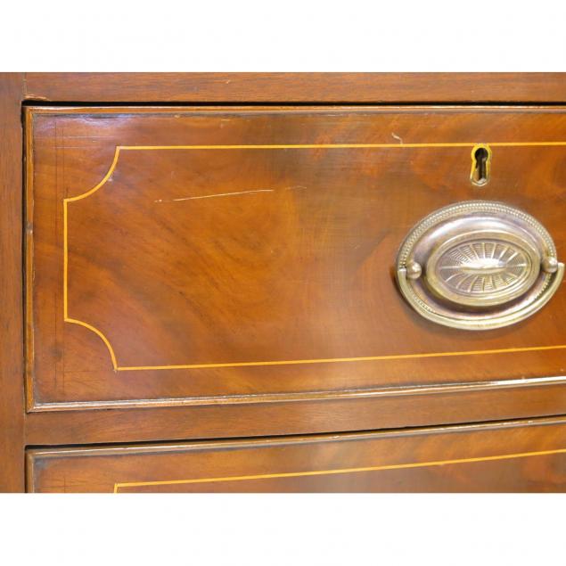 Early 19th century, mahogany, mahogany veneers, oak and pine secondary, banded veneer border to top, two over three graduated cock bead drawers.