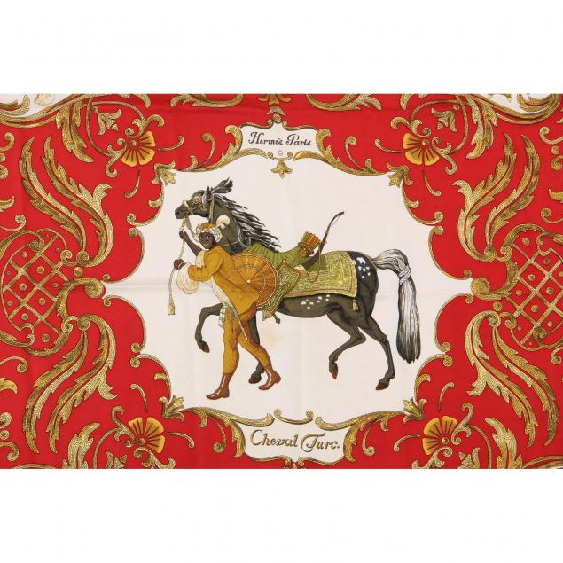 Made in France, first issued in 1969 designed by Chritiane Vauzelles, vibrant red field centered with a young blackamoor leading a horse. Lacking care tag.