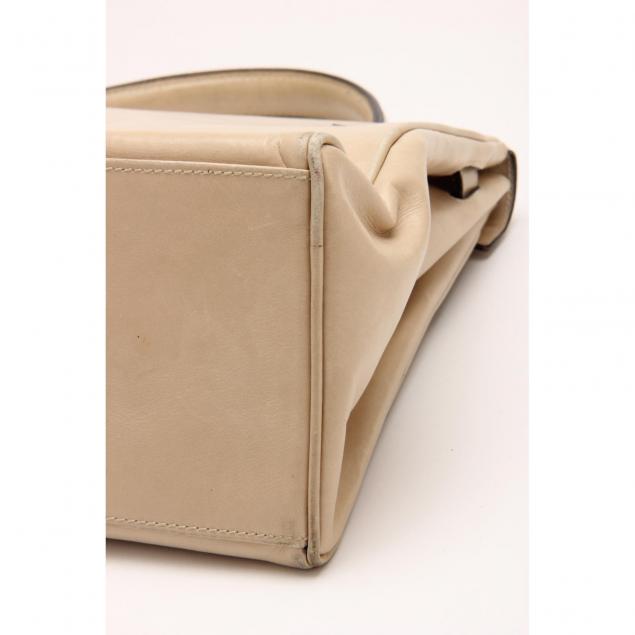Made in Italy, composed of beige calfskin, a top handle bag with strap handle and overlapping leather bands having a brass twist closure.