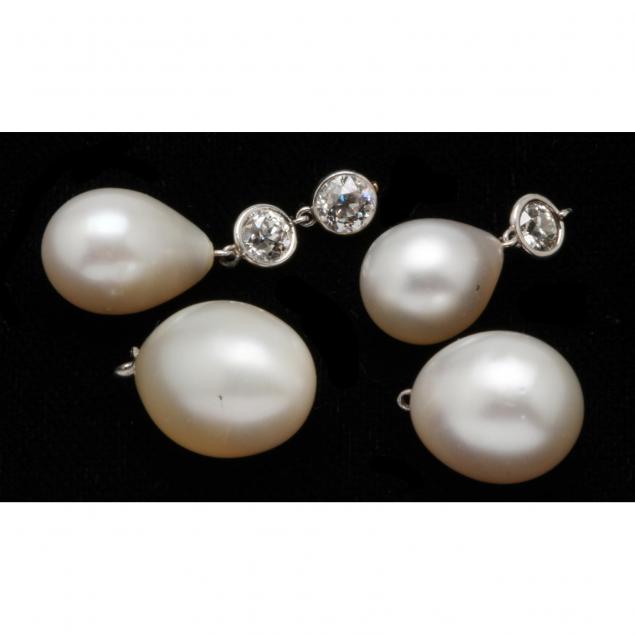 To include (2) drilled pear shape pearls (17.70 x 12mm) and 12.20 x 9.60mm) and (2) pearls with bezel set diamonds (13.60 x 10.00mm) and 13.80 x 10.00mm).