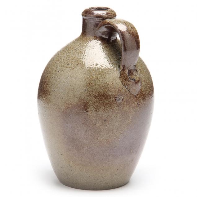 Salt glazed stoneware, with orange peel effect to shoulder and pulled strap handle with thumb print to handle base, impressed stamp "H. Fox" to shoulder.