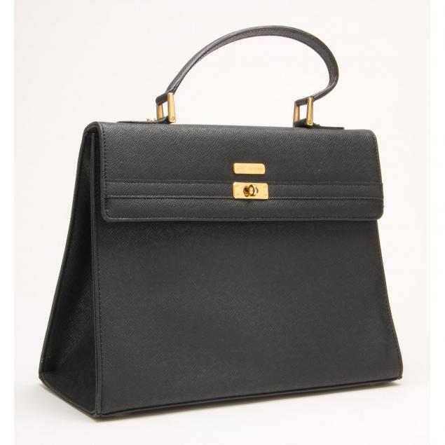 Top handle bag composed of textured leather , removable shoulder strap, patent leather zippered cosmetic pouch with integral mirror included.