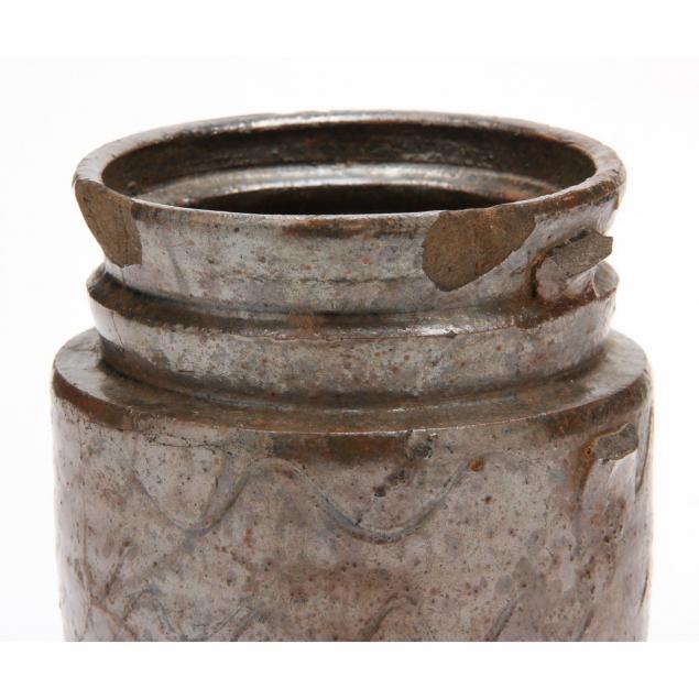 Dark alkaline glaze possibly with Albany slip; pint size, (3) bands of sine wave decoration, stamped PCH.