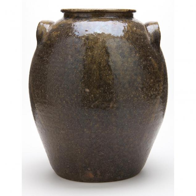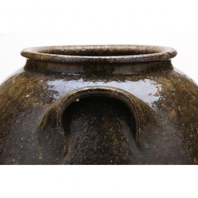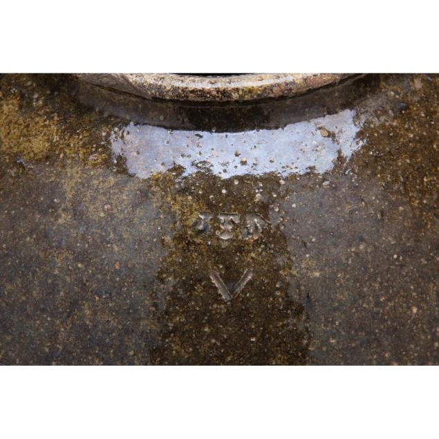 (5) gallon size, bulbous ovoid form with applied ear handles, dark alkaline glaze, stamped at shoulder "JFS" with "V" capacity mark below.