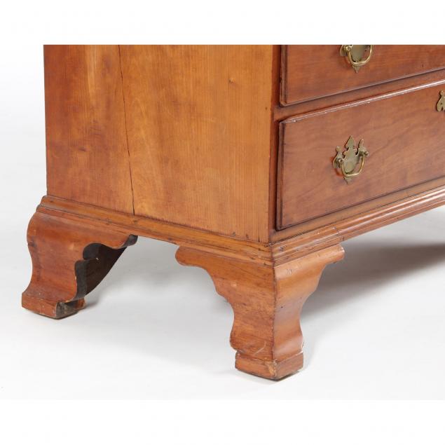 Late 18th century, cherry, white pine secondary, two-part form, upper case with small cove molded cornice above a reeded frieze, two upper paneled doors revealing a divided upper interior, base with hinged slant lid with drawered and divided interior, central three drawers with tombstone relief, four graduated lipped drawers raised on tall bold ogee bracket foot base.