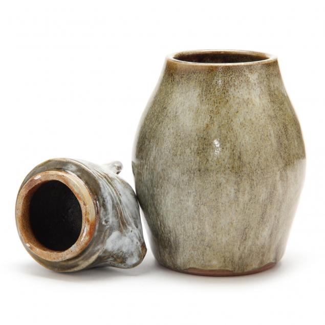 Jugtown Pottery, Pamela Owens, both in the form of cats, one decorated with a white slip, molded heads and faces, inscribed features with whiskers. Bottom with Jugtown stamp and potter's signature.