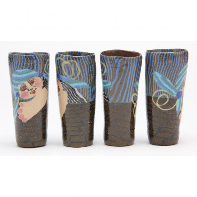 (8) pieces in total, to include; (4) cordials (4 in.); 3 mugs (the largest 3 in.); and a trinket box in the form of a tree trunk base with a flat paint-decorated lid (2.5 x 3 in.).