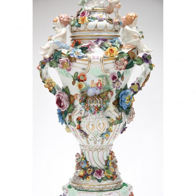 20th century, Saxon Porcelain Manufactory, lavishly adorned with blossoms, putti, and hand-painted floral clusters. The cover is embellished with a pierced Dresden crown as are the sides of the urn, the crown being the iconic symbol of Dresden porcelain, "SP" mark to the bottom.