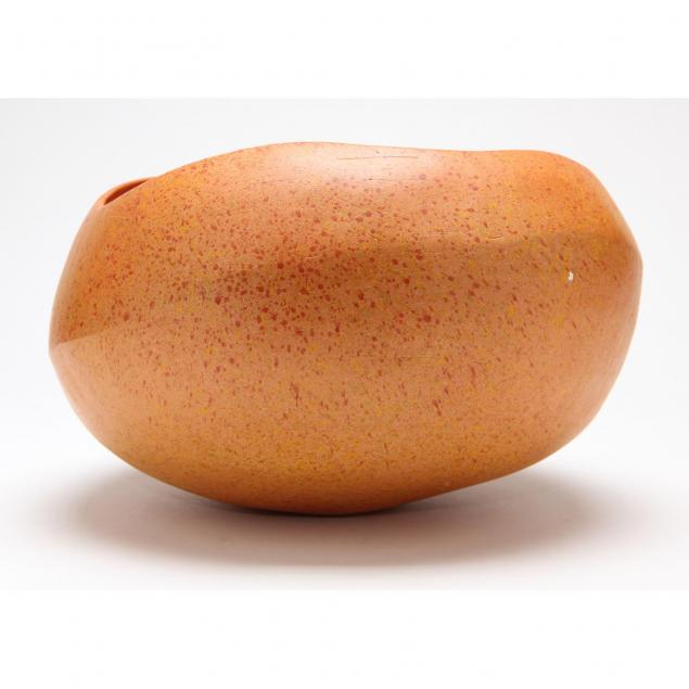 Charlotte and Penland, ceramic free form asymmetrical bowl glazed in a speckled orange, the form in keeping with Kitty's interest in spiral designs, unsigned.