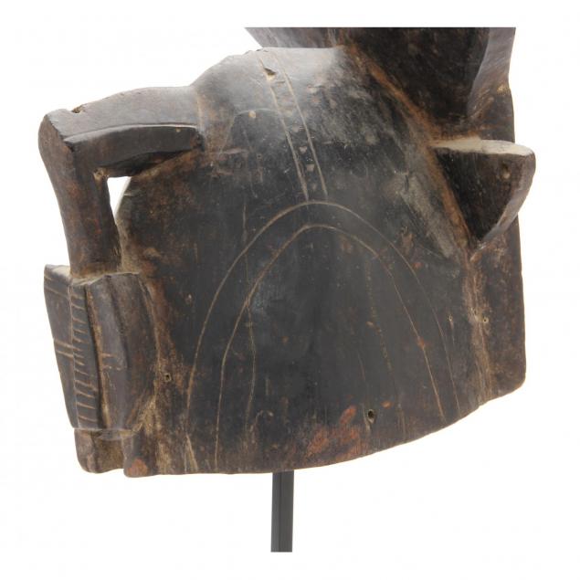 Ivory Coast, carved hardwood, helmet form. Presented on a black metal stand.