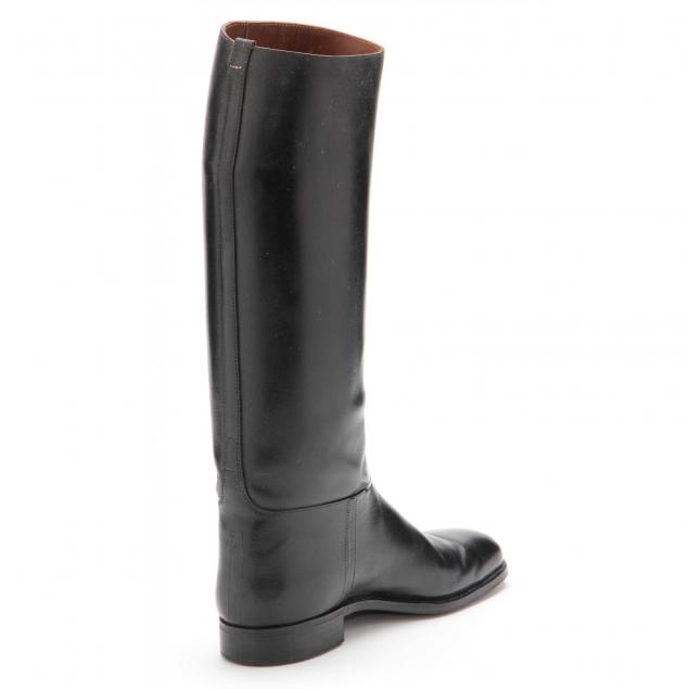 Paris and London, tall custom-made structured boot with graceful lines, sweeping curve from top of boot to instep, back seam, inside linen pulls. Fitted with original wood four-part trees with brass ring mounts. John Lobb stamp and crest to interior.