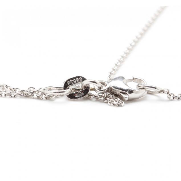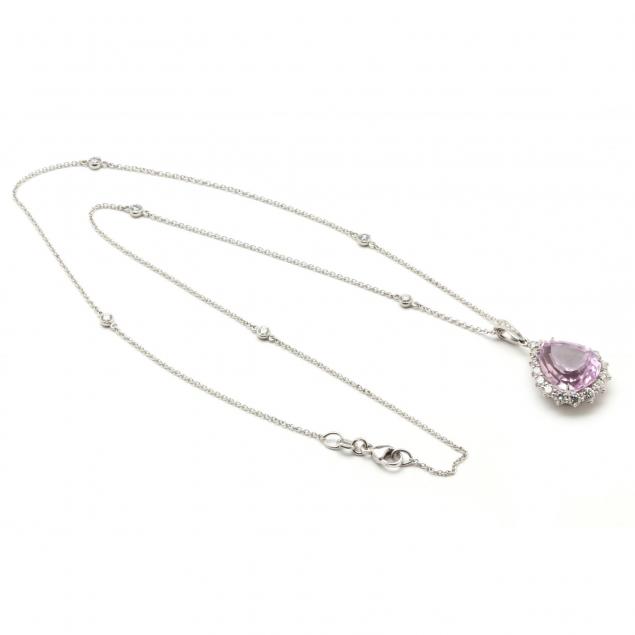The pear shaped kunzite gemstone (14.00 x 12.00 x 8.00mm) weighing approximately 7.69 carats and framed by (17) full cut round diamonds( 2.30mm-3.00mm, 6 at 2.50mm) and with bail accented with (4) diamonds (1.00-1.70) and suspended by a "diamonds by the yard" design necklace, the fine platinum necklace featuring (6) bezel set full cut round diamonds (2.50mm) terminating in a spring hook clasp marked platinum and signed "Balestra" and with maker's mark. Diamonds weigh approximately 1.60 total carats (E-F color, VS-SI1 clarity).