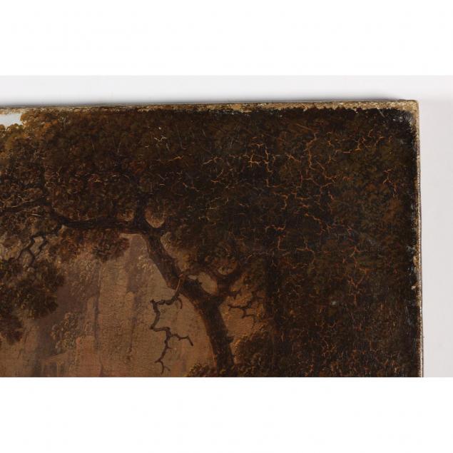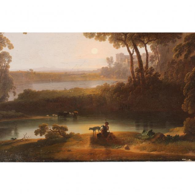 Born in England, Shaw is noted for his idealized landscapes often featuring exotic elements. Primarily self-taught, he emigrated to Philadelphia in 1817 when presented with the opportunity to install Benjamin West's painting, "Christ Healing the Sick," at the Pennsylvania Hospital. In 1819, he and his son traveled throughout Georgia, South Carolina, North Carolina and Virginia compiling sketches for a book, "Picturesque Views of American Scenery." Upon his return to Philadelphia, Shaw continued with his "grand Claudian-landscape tradition" and generated much interest with a widely circulated version of "Dido and Aeneus Going to the Hunt," which was exhibited at the Athenaeum in 1831, the Pennsylvania Academy of Fine Arts in 1832, and the National Academy of Design in 1835. Classical scenes, such as the painting offered here, were perfect foils for high style Philadelphia interiors. (see CLASSICAL TASTE IN AMERICA: 1800-1840 by Wendy Cooper)