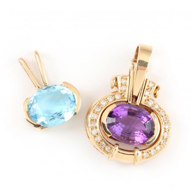 The geometric shaped oval gold and diamond set frame contains a total of (24) round brilliant cut diamonds weighing approximately .45 carat (H color, VS clarity); the gold mounted oval faceted amethyst pendant fits inside the frame with a screw mechanism and can be changed with the gold mounted oval faceted blue topaz pendant. Amethyst measures 13.20 x 15.20 x 9.20mm and the blue topaz measures 13.80 x 15.80 x 8.25mm.