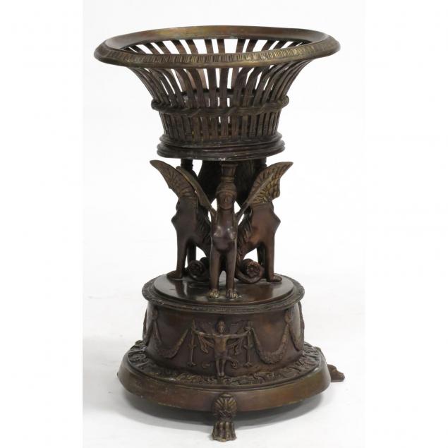 20th century, pierced basket with egg and dart trim, supported by triple sphynx over double stepped base with figural and foliate motifs, the whole raised on three paw feet, rim bears the mark "c. coaudion".