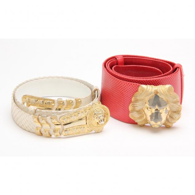 The first is of wide snakeskin with large lion head buckle (3 in. x 30 in.) (scrape to inside leather); the second is tan snakeskin with circular buckle, (1 5/8 x 33 in.) (wear at edges; creasing); the third is of gray leather with gold tone shield buckle flanked by panels cast with double headed eagles (1.75 x 31 in.) (some loss of surface to buckle edges; scratches to leather); the fourth is of white snakeskin with gold tone lion head buckle, (1.25 x 33 in.) ( in need of cleaning). All belts are signed on the leather.