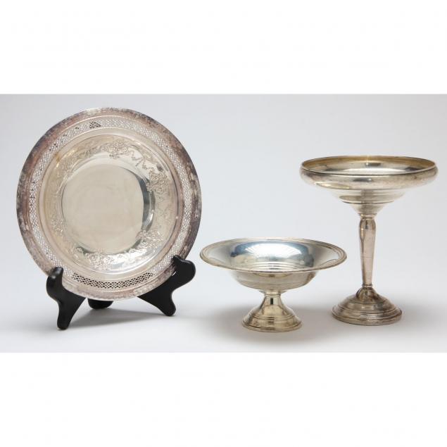 Including a weighted base compote (6.5 in.), a sugar & creamer set, (2) footed low bowls; unweighted cordial and (4) matchbook covers; and a silverplate bowl.