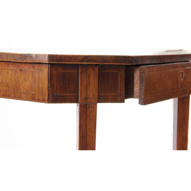 Late 18th century, mahogany, mahogany veneer, oak secondary, diminutive rectangular form with octagonal top, triple line banded edge border, cross banded edge, single drawer, drawer and sides with triple line inlay and vertical veneer work, raised on tall delicate square tapered legs.