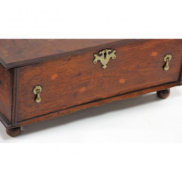 Early 18th century, elm and oak, rectangular form, hinged molded lid retaining original fish tail hinge, open interior, front board with vine and tulip inlay flanked by an applied reeded style, raised on suppressed ball foot.