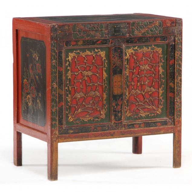 Early 20th century, rectangular case with hinged lid, front panels with relief floral and branch design, side panels with painted bird and floral motif.