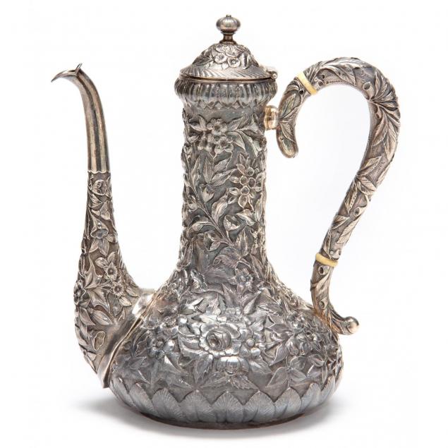 Likely made by Samuel Kirk of Baltimore, circa 1890. The three piece service including a demitasse pot (8.5 in.) with a parcel gilt open sugar bowl and creamer. Each engraved on the underside in period scripts "MGG 1882," "BAW 1914" and "VGR 1956."