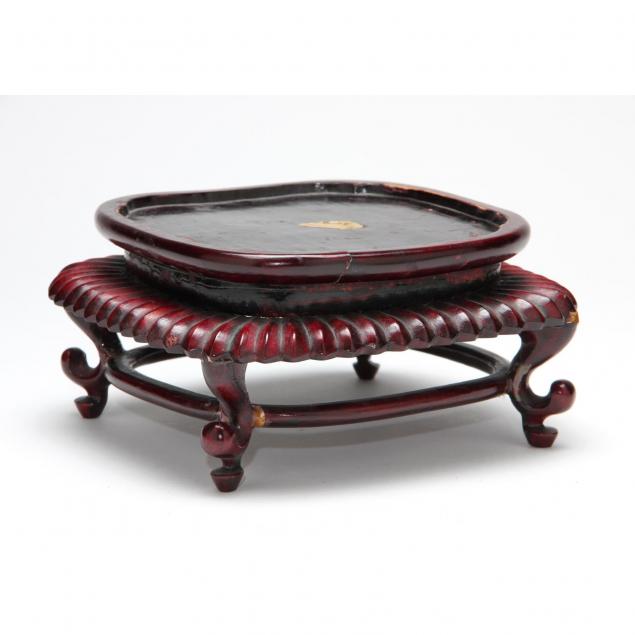 With Jiangxi production mark to underside, the exterior painted in enamels with ducks and cranes in a lotus laden pond against a yellow ground, turquoise glazed interior, presented atop a custom hardwood stand.