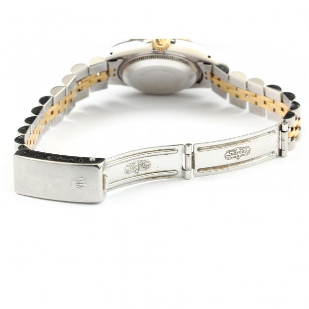 Circa 1991, the stainless steel case with fluted gold bezel, champagne dial with diamond hour markers, date aperture at 3:00 hour, completed with stainless steel and gold Jubilee bracelet band, serial number #X275610 and reference / model number 69173.