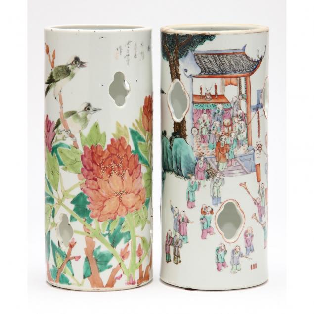 The first, Qing Dynasty, depicts a procession and musicians (11.5 in.) (tight surface hairline); the second is colorfully painted with birds perched on flowering shrubs (11.25 in.)