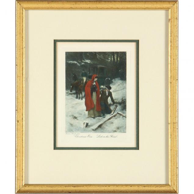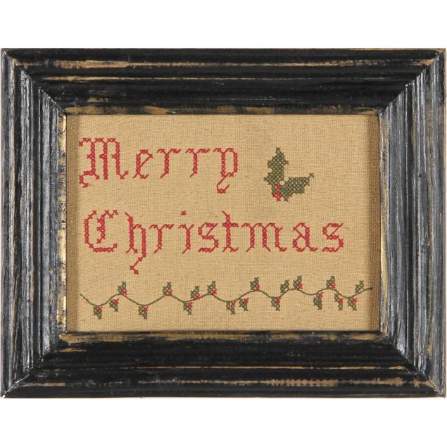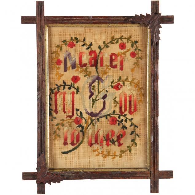 Including a "Merry Christmas" needlework in antiqued frame (8.25 x 10.5 in.); a colored bookplate titled "Christmas Eve / Lost on the Road" (10.5 x 9 in.); and a framed needlework "Nearer My God to Thee" in antique frame (18.5 x 14.5 in.).