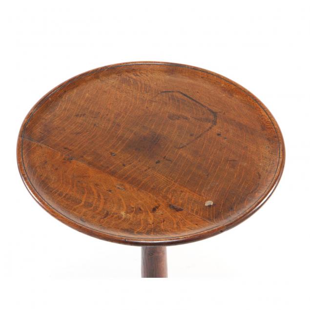18th century, oak, molded and scratch beaded dish top, urn standard, tripod base with raised pad snake foot.