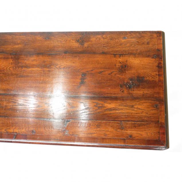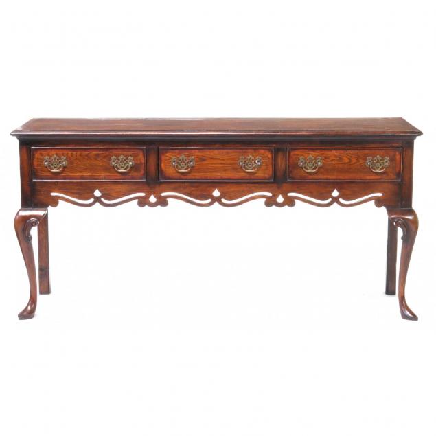 Contemporary, oak with mahogany veneers, banded top, three drawers with pierced carved skirt, raised on two cabriole front legs, labeled.