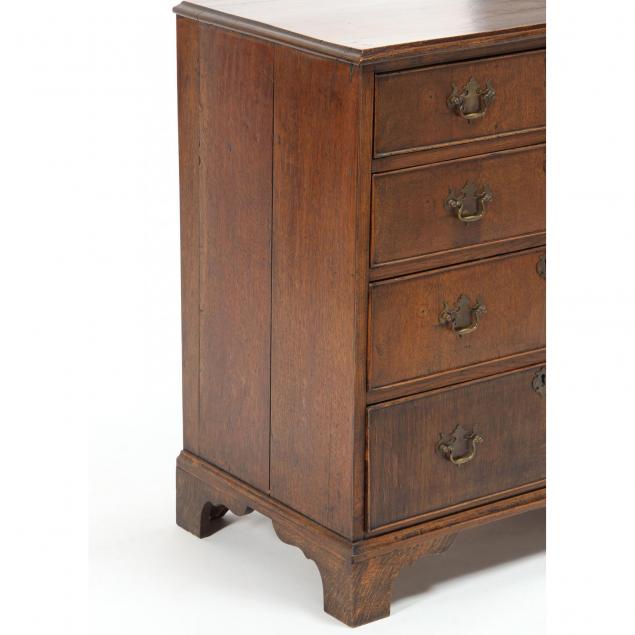 Circa 1900, oak veneer, pine secondary, with molded top, four graduated drawers with cock beading, bracket foot base.
