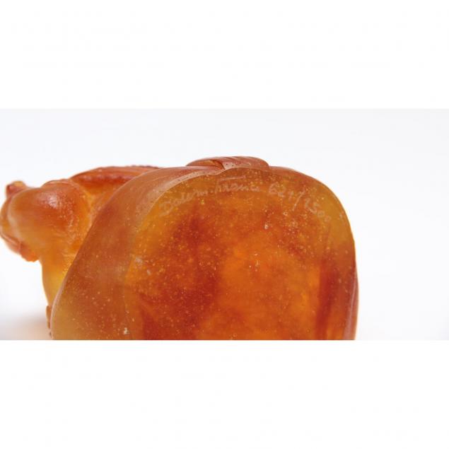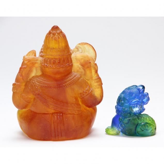 French, contemporary, including an amber colored seated Ganesha, and a green/blue foo dog, each signed "Daum France"